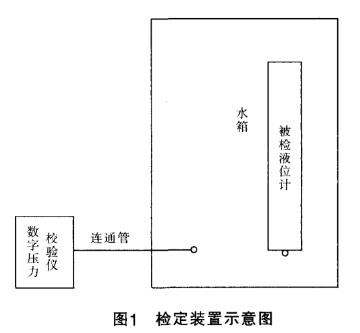 該檢定裝置如圖1所示,包括數(shù)字壓力校驗(yàn)儀、水箱、連通管、水箱、各種液位計接口和固定裝置。