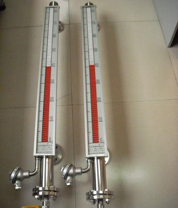 液位計根據浮力原理,浮子在測量管內隨液位的升降而上下移動,浮子內的永久磁鋼通過磁耦合作用,驅動紅、白色翻柱翻轉180’液位上升時,翻柱由白色轉為紅色,下降時,翻柱由紅色轉為白色,從而實現液位的指示。