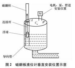 圖2中,B點(diǎn)靠近電機(jī)和泵,耐高溫磁翻板液位計(jì)安裝在此處既影響電機(jī)及泵的檢修,又因泵附近液位的環(huán)流波動(dòng)較大,對(duì)浮子導(dǎo)向管沖刷嚴(yán)重,故B點(diǎn)不合理;C點(diǎn)處因有管道通過(guò),不便維護(hù)且影響管道和泵、電機(jī)等的起吊更換,故也不能選擇C點(diǎn);A點(diǎn)遠(yuǎn)離泵和電機(jī),且有足夠的空間安裝翻板,便于維護(hù),所以A點(diǎn)較為合適。