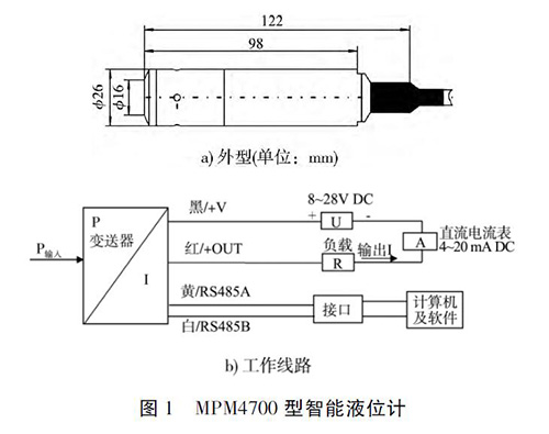 頂裝型磁翻板液位計以微處理器為核心單元,具有檢測、判斷和信息處理功能。其測量水位的基本原理是利用半導(dǎo)體硅材料的壓阻效應(yīng),實現(xiàn)液位壓力與電信號的轉(zhuǎn)換[2]。即把與液體深度成正比的液體靜壓力,通過液位計( 變送器) 轉(zhuǎn)換成電流信號輸出,從而建立輸出電信號與液體深度的線性對應(yīng)關(guān)系,實現(xiàn)對液位( 水位) 的測量。沉箱水位監(jiān)測選用MPM4700 型頂裝型磁翻板液位計,該液位計以擴散硅壓阻式傳感器為管芯,集成變換器電路、微處理芯片為一體,其性能穩(wěn)定,結(jié)構(gòu)緊湊,外圍線路簡單。該液位計為四線制,可同時輸出一組4 ~ 20 mA 的標準電流信號和RS486 數(shù)字信號。MPM4700 型智能