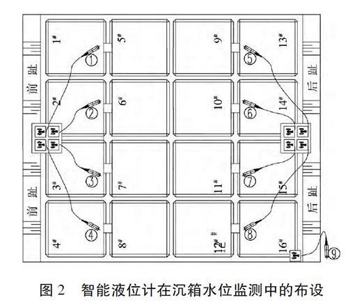 為了避免在沉箱頂部現(xiàn)場布線和減少高空作業(yè)時間,沉箱水位監(jiān)測擬采用無線傳輸方式,頂裝型磁翻板液位計采集的沉箱水位數(shù)據(jù)信號通過無線發(fā)射和無線接收的方式,傳輸?shù)诫娔X進行數(shù)據(jù)處理后,在屏幕上直觀顯示出大型沉箱不同格倉水位和倉外吃水深度。一個MPM4700 型頂裝型磁翻板液位計對應(yīng)一個獨立的無線發(fā)射單元,根據(jù)所監(jiān)測的沉箱格倉數(shù)量來確定無線發(fā)射單元的數(shù)量。每個無線發(fā)射單元包括卷線盤、MPM4700 型頂裝型磁翻板液位計、485 轉(zhuǎn)換器、無線發(fā)射器、無線發(fā)射天線、移動電源等;無線接收單元與筆記本電腦相連接,包括無線接收器、無線接收天線、移動電源。無線發(fā)射器和發(fā)射天線固定在卷線盤上,攜帶輕便,在沉箱出運施工平臺吊裝時,卷線盤綁扎在施工平臺的人行通道旁,隨施工平臺吊升到沉箱頂部; 需要監(jiān)測時施工人員通過卷線盤放線,頂裝型磁翻板液位計探頭放入到沉箱格倉底部,打開無線發(fā)射單元的移動電源即可。以漳州后石港區(qū)3 號泊位工程沉箱為例,該工程沉箱為16 個格倉,沿前趾和后趾方向的相鄰2 個格倉設(shè)置通水孔相互連通。因此,通過監(jiān)測沉箱前趾4 個格倉和后趾4 個格倉的水位,就可以掌握整個沉箱的平衡狀態(tài)。在沉箱水位監(jiān)測時,總共布設(shè)9 個MPM4700 型頂裝型磁翻板液位計,平行前趾或平行后趾4 個格倉分別布設(shè)4 個液位計,1個液位計放在格倉外與沉箱底齊平以監(jiān)測半潛駁下潛時沉箱的吃水深度( 圖2) 。