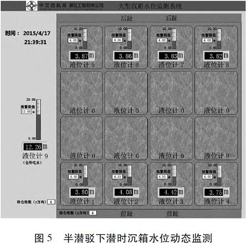 漳州后石港區(qū)3 號泊位碼頭工程采用重力式沉箱結(jié)構(gòu),該工程沉箱共15 件,單件質(zhì)量4 365 t,沉箱長、寬、高分別為19. 8、21. 9 、25. 0 m; 沉箱分7 層澆筑,澆筑*頂層時3# 格倉按設(shè)計圖紙預(yù)留3 m 高的缺口。在漳州預(yù)制廠預(yù)制,沉箱安裝施工現(xiàn)場距離預(yù)制廠約6. 3 km。沉箱采用氣囊橫移至出運通道,再縱移至出運碼頭前沿線上駁,采用8 000 t 半潛駁下潛安裝。根據(jù)浮游穩(wěn)定計算,沉箱各格倉壓載水見圖4。2#、6# 格倉為3. 98 m,3#、7#格倉為4. 34 m,其余格倉為3. 80 m,沉箱倉外吃水12. 15 m。根據(jù)當?shù)厮恼境毕恚?015-04-17T20∶30 下潛坑潮位條件符合下潛要求,半潛駁在下潛區(qū)開始加水下潛; 下潛至沉箱吃水1. 8 m 時,同時開啟沉箱的8 個注水閥門開始向沉箱格倉中注入壓載水; 當沉箱吃水5 m 時半潛駁暫停下潛,起重船靠近半潛駁,工人將連接起重船吊鉤的鋼絲繩用卡環(huán)固定在沉箱頂部吊環(huán)上。半潛駁繼續(xù)下潛至9 m 時再暫停下潛,等待吊纜就位。半潛駁繼續(xù)下潛,在沉箱底與枕木支墊處于脫離的臨界狀態(tài)時,減緩半潛駁下潛速度,直至沉箱完全脫離浮船塢。此時啟動吊機,使鋼絲繩處于輕微受力狀態(tài)。在半潛駁下潛及沉箱格倉注入壓載水過程中,通過大型沉箱水位監(jiān)測系統(tǒng)能夠動態(tài)顯示各格倉水位值及沉箱的吃水深度( 圖5)