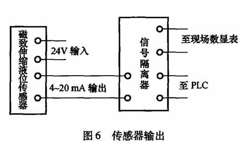 MTS的磁致伸縮式液位儀為法蘭安裝,貯罐罐頂已留有預(yù)留孔。安裝時(shí),調(diào)試過程簡(jiǎn)單,只需通過調(diào)試測(cè)量頭上的智能型儀表,標(biāo)定上、下限液位數(shù)據(jù)后即可。輸出的標(biāo)準(zhǔn)信號(hào)4 ~ 20mA通過隔離光柵直接與PLC的模數(shù)轉(zhuǎn)換模塊相連。