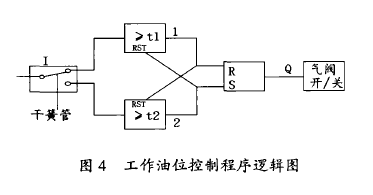 液位計(jì)筒體內(nèi)徑d/~i0mm,標(biāo)尺長(zhǎng)750mm。750mm×20%=150mm,280÷750=37.3%),液位計(jì)油位滯后于貯罐油位變化。液位計(jì)回油時(shí),浮筒漂向管口,則阻尼作用更強(qiáng)了,低油位*限開關(guān)LB/LVL6不能及時(shí)動(dòng)作和關(guān)閉氣閥LB/EV2是造成貯油罐泄空而計(jì)算機(jī)未執(zhí)行油位故障處理程序的原因。圖3 液位計(jì)故障剖析圖3.2 液位檢測(cè)開關(guān)和控制程序干簧管式接近開關(guān)本身依靠磁控開或合,易受周圍磁場(chǎng)干擾產(chǎn)生誤動(dòng)?,F(xiàn)場(chǎng)液位計(jì)安裝位置一側(cè)與電纜橋架相鄰,而另一側(cè)常有行車電磁吸盤吊裝鋼卷作業(yè)。從工作油位控制邏輯過程可以看出(圖4):盡管油位檢測(cè)開關(guān)已通,每15s(t1=t2=15s)內(nèi),只要存在一次脈沖干擾,開氣閥電路回路將未被選通。反之亦然。因此,干簧管式接近開關(guān)誤動(dòng)產(chǎn)生錯(cuò)誤控制,也是釀成事故的另一個(gè)原因。