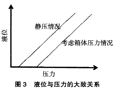 針對設(shè)備的故障,技術(shù)人員采取了更換多種質(zhì)量好的磁感應(yīng)開關(guān)(如耐高溫型等),以及基于磁翻板的外貼式模擬量液位控制,但效果均不理想。其他液位測量(如超聲波等)造價較高,而且需要對設(shè)備進行相應(yīng)的改造,并且停運一段時間,而該系統(tǒng)屬于公用,上述條件均無法滿足。既要實現(xiàn)自動控制,又要相應(yīng)允許實施。技術(shù)人員再次結(jié)合系統(tǒng)圖進行了分析:該水位溢流處和下限處范圍還是比較寬裕,而且箱體為非承壓容器,所以箱體內(nèi)的壓力和大氣壓相差不大,即便是有也基本上保持恒定,結(jié)合原水位測量的結(jié)構(gòu),考慮在海水液位計的液位測量筒下部加裝1臺壓力變送器,在箱體壓力不是很大且基本恒定的情況下,液位與壓力值基本成對應(yīng)關(guān)系(只是在現(xiàn)場修正疊加一個常數(shù)值來消除箱體上不恒壓所帶來的偏差)。液位與壓力的關(guān)系曲線見圖3。