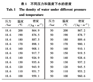 在實際過程中,加熱器中不同位置的水溫是不一致的,它和加熱器的形狀、體積等條件有關(guān),同理在測量通道中不同位置的水溫也是不一致的。這會對理論計算造成較大的困難,在此對容器中水的溫度分布做了簡化。如圖1所示,在閥門V的左端為加熱器的水溫,假設(shè)水溫一致,且都為T1,在閥門V的右端為測量通道的水溫,設(shè)水溫一致,且都為T2。在加熱器額定工作壓力P的情形下,T1溫度和T2溫度下對應(yīng)的水的密度分別為ρ1和ρ2。在閥門V處,左端的壓力等于右端的壓力,由此可得:
