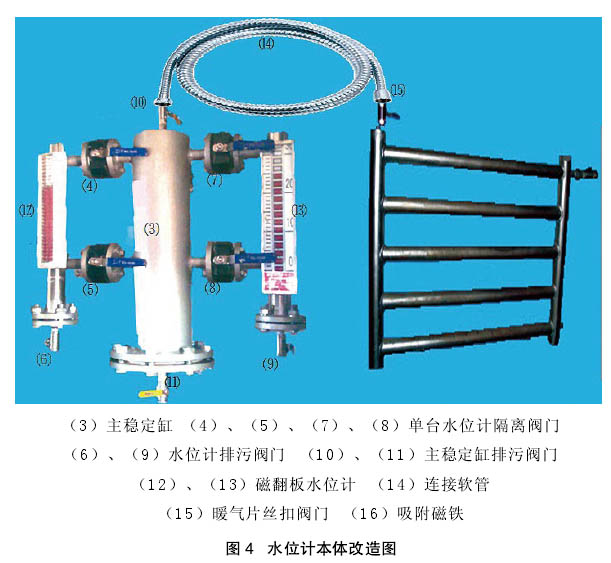自2009年以來,公司先后對水位計進行了5次改進:安裝磁鐵吸附雜質(zhì)、擴大連通管徑并安裝隔離控制閥門、擴大穩(wěn)定缸容積、實行雙水位計并聯(lián)讀數(shù)及安裝沖洗閥門,改進前如圖1所示。