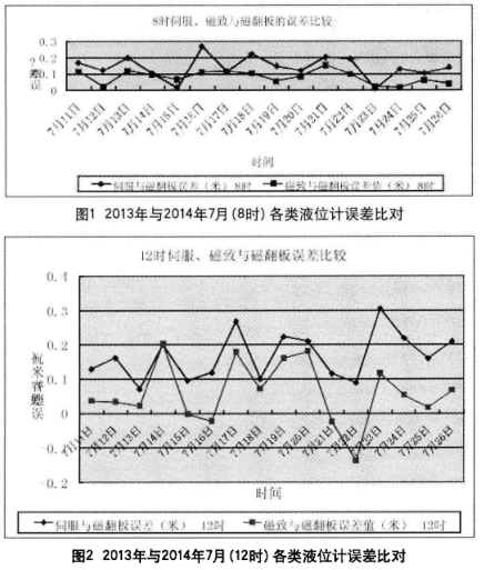 由以上兩圖得知,伺服液位計誤差值曲線較高,液位漲浮較大,計量誤差*髙達+0.3m,而磁致液位計誤差值曲線相對穩(wěn)定,液位漲浮較小,計量誤差在±0.2m之間,較為精準(zhǔn)。