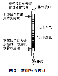 它結(jié)構(gòu)是利用旁通管的原理, 主導(dǎo)管內(nèi)的液位和尾水管內(nèi)的液位高度一致, 根據(jù)阿基米德定理, 磁性浮子在液體中產(chǎn)生的浮力和重力平衡, 當(dāng)尾水管中的水位升降時(shí), 液位計(jì)主導(dǎo)管內(nèi)的浮子也隨之升降, 浮子內(nèi)的永久磁鐵通過磁耦合驅(qū)動(dòng)指示器內(nèi)的翻板指示器, 當(dāng)液位上升或下降時(shí), 翻板指示器由白色翻轉(zhuǎn)為紅色, 或由原來的紅色翻轉(zhuǎn)為白色, 指示器的顏色改變的高度就是被測(cè)水位的實(shí)際高度, 從而實(shí)現(xiàn)液位的現(xiàn)場(chǎng)指示, 以供運(yùn)行人員目測(cè)尾水管的實(shí)時(shí)水位。安裝于液位計(jì)管壁外側(cè)的磁記憶開關(guān),可多點(diǎn)設(shè)置、滑動(dòng)調(diào)整位置, 提供了液位開關(guān)量報(bào)警功能。在裝置的頂部安裝了一個(gè)自動(dòng)排氣裝置, 當(dāng)主導(dǎo)管內(nèi)液位上升時(shí)能夠自動(dòng)的排氣, 下降時(shí)能夠按時(shí)補(bǔ)氣。