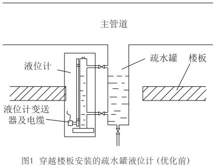 田灣核電3#、4#機(jī)組現(xiàn)場疏水罐液位測量*先采用兩個連通管把液位計(jì)測量筒與疏水罐連通,測量筒內(nèi)部含有磁浮子,磁浮子高度隨疏水罐內(nèi)液位變化,測量筒外部安裝測量桿,感受磁浮子高度,再通過下部變送器轉(zhuǎn)化成電流信號輸出到DCS系統(tǒng)。一些蒸汽管道安裝布置貼近地面,疏水罐穿越樓板,這樣就使液位計(jì)安裝后變送器位于樓板下部,即下一層廠房的房頂;如圖1所示。
