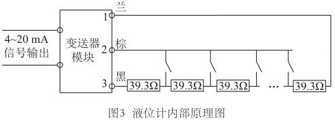 為尋求更好的改進(jìn)方案,對防爆磁翻板液位計(jì)的測量原理進(jìn)行了深入研究。液位計(jì)測量桿中是由等間距排布的干簧管和電阻元件組成,當(dāng)磁浮子達(dá)到某一高度時,對應(yīng)的干簧管閉合,如果能識別出哪個干簧管閉合,即可獲得當(dāng)前液位值。那么變送器又是如何識別出哪個干簧管閉合的呢?再次探究測量桿內(nèi)部電路,繪制液位計(jì)內(nèi)部原理圖,如圖3所示。測量桿內(nèi)部電阻串聯(lián)連接,每兩個電阻的連接處連接干簧管的一端,干簧管的另一端并聯(lián)連接,*終引出蘭、棕、黑三根信號線。