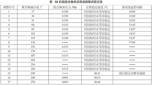 (4)方案四:調整組合軸承潤滑油量經過主機制造廠設計部計算復核,認為現有油泵有可能滿足冷卻要求。經過與電廠溝通,聯(lián)合制定了減少組合軸承用油量的試驗方案。主要措施為:在組合軸承供油管調節(jié)閥后組合軸承前增加一壓力表,用于監(jiān)視組合軸承供油壓力。機組在滿負荷運行條件下,分階段逐步調整節(jié)流閥減少供油量,監(jiān)視記錄組合軸承供油壓力和組合軸承溫度,直到單臺油泵滿足用油量略有余量、備用泵處于備用狀態(tài)下,正向推力瓦*高溫度控制 55℃以內。*后恢復單冷卻器運行和環(huán)境溫度*高條件下檢驗軸承溫度。