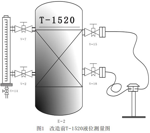以溶劑吸收工段吸收塔T-1520為例,將該塔處的就地電遠(yuǎn)傳磁翻板液位計(jì)改為反吹法測量液位,并且至中控室,使得T-1520原有的電遠(yuǎn)傳磁翻板液位計(jì)LT-1510多一道對比和參考,對生產(chǎn)工藝的操作更有參考價(jià)值。