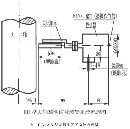 該電站蠕動探測之前主要使用的是氣動式機(jī)械蠕動裝置和電動式機(jī)械蠕動裝置,哈電機(jī)組和 VHS 機(jī)組使用的是氣動式蠕動裝置,型號為 RD-A 哈控,RD-A 型蠕動探測裝置由投切器和發(fā)訊單元兩部分組成,當(dāng)機(jī)組停機(jī)完成后通過蠕動控制電磁閥(空氣電磁閥)向投切器通入壓縮空氣,它將發(fā)訊單元向前推進(jìn),使其磨擦盤與機(jī)組大軸表面相接觸(有稍許正壓力)。如果大軸發(fā)生蠕動,轉(zhuǎn)角達(dá)到 1.5° ~2°時,發(fā)訊單元便發(fā)出大軸蠕動信號,作用于報(bào)警與制動回路,投入制動閘以防蠕動現(xiàn)象擴(kuò)延。機(jī)組起動前,先動作空氣電磁閥使投切器排氣,由于彈簧力的作用,發(fā)訊單元退回原位。離開大軸表面 6 mm~8 mm,確保裝置安全。RD-A型蠕動探測裝置系統(tǒng)原理如圖1所示。RD-A型探測裝置易卡澀導(dǎo)致探測裝置投退失敗,影響開停機(jī)成功率。東電機(jī)組使用的是電動式蠕動裝置,型號為 PXJ-1D。PXJ-1D 型蠕動探測裝置多起反饋信號拒動的事件,導(dǎo)致開停機(jī)流程退出,其原因?yàn)殡妱邮饺鋭友b置控制回路與位置反饋節(jié)點(diǎn)取自同一個行程開關(guān),當(dāng)行程開關(guān)常閉節(jié)點(diǎn)斷開時,電機(jī)停止轉(zhuǎn)動,而此時可能因行程過短導(dǎo)致常開節(jié)點(diǎn)尚未閉合,位置信號無法正常上送至監(jiān)控系統(tǒng)。為了解決這一問題,目前電站 15 臺機(jī)組蠕動探測裝置已換型為非接觸式蠕動探測裝置,避免開停機(jī)過程中投入或退出蠕動失敗導(dǎo)致的流程退出。非接觸式蠕動探測裝置設(shè)計(jì)原理為 :
