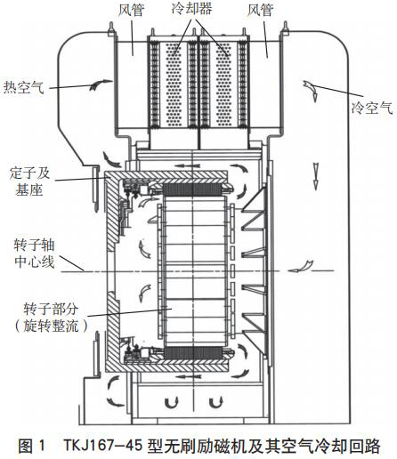 某核電廠的勵磁機采用ALSTOM生產(chǎn)的TKJ167-45 型無刷勵磁機,該型號的勵磁機采用循環(huán)空氣冷卻,兩臺空氣冷卻器并排安裝在勵磁機的正上方,冷卻空氣在冷卻器、風(fēng)管以及勵磁機外罩連接形成的閉合風(fēng)路中進(jìn)行強迫循環(huán),具體情況如圖 1 所示。