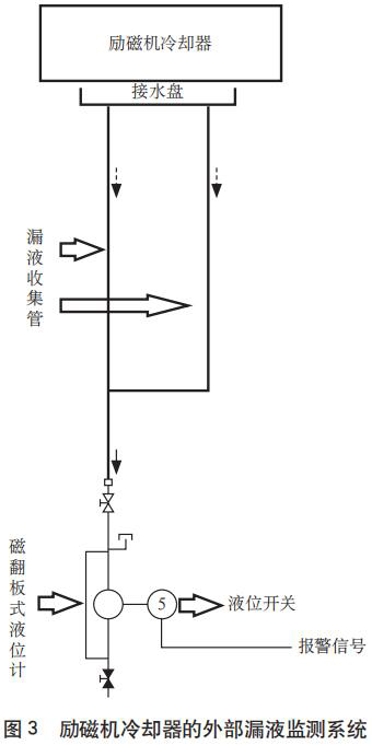 實際運行經(jīng)驗表明,球罐液位計內(nèi)部銅管發(fā)生泄漏的概率較低,但一旦發(fā)生泄漏,漏液會隨著冷卻空氣沿閉合風(fēng)路進(jìn)入勵磁機內(nèi)部,造成勵磁機短路損壞的嚴(yán)重后果。為了保證機組安全,應(yīng)有冷卻器內(nèi)部銅管泄漏監(jiān)測裝置,然而現(xiàn)場沒有配置此類裝置。