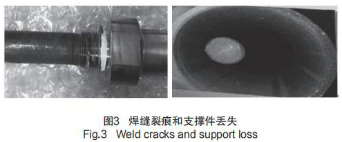 在歷次大修執(zhí)行 GSS 系統(tǒng) MSR 純水處理液位計(jì)預(yù)防性維修檢查時(shí)發(fā)現(xiàn),部分導(dǎo)波桿支撐件破碎并丟失,同時(shí)存在探桿根部焊縫有裂痕的問(wèn)題,見(jiàn)圖 3 焊縫裂痕和支撐件丟失。