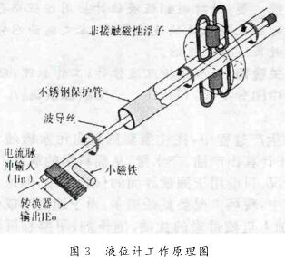 其工作原理是利用磁場(chǎng)脈沖波,測(cè)量時(shí)液位計(jì)的頭部發(fā)出電流“詢(xún)問(wèn)脈沖”,此脈沖同時(shí)產(chǎn)生磁場(chǎng),沿波導(dǎo)管內(nèi)的感應(yīng)線向下運(yùn)行,在液位計(jì)管外配有浮子,浮子可隨液位沿側(cè)桿上下移動(dòng),浮子內(nèi)設(shè)有一組永久磁鐵,其磁場(chǎng)與脈沖產(chǎn)生的磁場(chǎng)相遇則產(chǎn)生一個(gè)新的變化磁場(chǎng),隨之產(chǎn)生新的電磁“返回脈沖”,測(cè)定“詢(xún)問(wèn)脈沖”和“返回脈沖”的周期便可知道液位的變化。因此,磁致式液位計(jì)是以浮子為測(cè)量元件通過(guò)磁耦合的變化傳遞到指示器,使指示器能夠清晰地指示出液位的高度。
