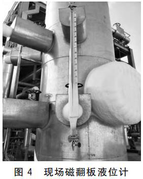 現(xiàn)場磁翻板液位計(jì)(圖4)由于儲(chǔ)罐壓力偏高,正常生產(chǎn)時(shí)為3MPa,導(dǎo)致磁翻版液位計(jì)浮子被壓扁。解決方法:尋找能夠生產(chǎn)耐高壓低密度液位計(jì)浮子廠家。