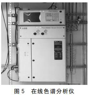 (1)利用電加熱氣化取樣探頭,把測量介質(zhì)引入在線色譜分析儀,實(shí)時(shí)分析氣體組分。在使用在線色譜分析儀(圖5)時(shí),需要配合標(biāo)氣及載氣,提前對(duì)色譜進(jìn)行標(biāo)定。預(yù)處理部分,先把每個(gè)取樣管路取下來吹掃5~10min(取樣探頭壓力設(shè)定為2~3kg),保證沒有雜質(zhì)摻入,然后接上管線。要注意定期檢查色譜載氣(H2或者N2)使用情況,及時(shí)更換。如果更換不及時(shí),在使用完之前,*好停用色譜,防止燒壞檢測器。