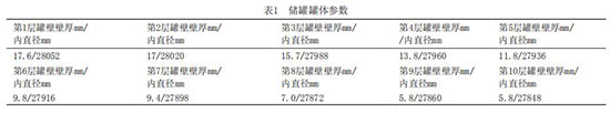 (1)改造前對儲罐的罐體進行了超聲波測厚以及材料的化學成分及性能分析,其材質(zhì)滿足現(xiàn)行的使用條件,其儲罐的罐體參數(shù)及每層罐壁的厚度(實測)見表1,罐壁的每層壁板高度為1690mm,其搭接寬度為40mm,縱焊縫為對接結構,見表1。