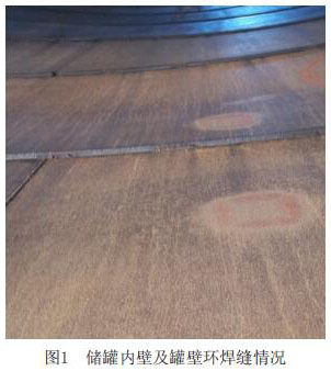 儲罐結構型式為拱頂罐,罐壁的環(huán)焊縫為搭接結構,其罐壁的焊縫均沒有進行處理,有一定的焊縫余高,罐體內(nèi)直徑隨著高度的增加直徑在變小。儲罐原為原油儲罐,雖然經(jīng)過蒸汽吹掃,罐壁上仍附著油污,罐內(nèi)的防腐層破壞嚴重。儲罐在制造時,對鋼板的內(nèi)表面要求處理的粗糙度等級不高,使內(nèi)壁殘留許多小的焊瘤、焊渣等,該類殘留物部分有鋒利的銳角。其具體情況如圖1所示。