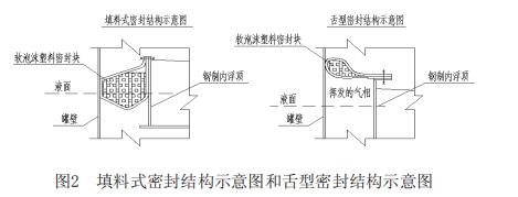 鋼制內(nèi)浮頂與罐壁之間的密封通常采用彈性材料密封結構,根據(jù)彈性密封件的結構和斷面尺寸,密封的結構形式主要可以分為填料式密封和舌型密封結構兩大類。兩者的密封結構示意見圖2: