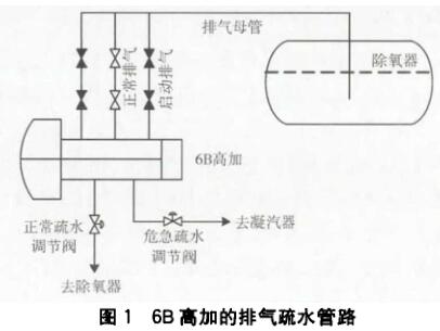 6B高壓加熱器設(shè)有2路啟動排氣和1路正常排氣,3路排氣管道匯至1根管道進人除氧器并插人除氧器正常液面以下,如圖1所示。啟動階段高壓加熱器啟動排氣閥門和正常排氣閥門均開啟排氣,正常運行時啟動排氣閥關(guān)閉,正常排氣閥開啟。排氣管線從7.5 m平臺經(jīng)過多次折向匯集到23 m排氣母管,然后再引人除氧器,這導(dǎo)致排氣管線存有蒸汽冷凝水;由于在排氣管線上存有一定的冷凝水,啟動排氣閥開啟后,存在于排氣管道的冷凝水依靠重力排至高壓加熱器汽側(cè),在啟動排氣管至除氧器的管路中形成一定的真空,從而產(chǎn)生虹吸作用,使除氧器的水吸人6B高壓加熱器,導(dǎo)致B側(cè)高壓加熱器液位異常升高而發(fā)生解列。