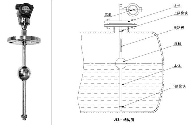 鍋爐浮球液位計(jì)由浮球、插桿等組成。浮球液位計(jì)通過(guò)連接法蘭安裝于容器頂上