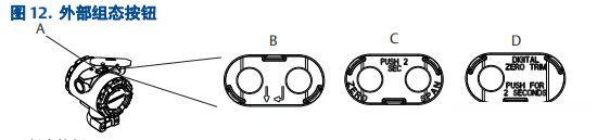 使用位于頂部銘*下、三組可能的外部組態(tài)按鈕中某一組進(jìn)行零點(diǎn)調(diào)校。為了操作組態(tài)按鈕,需要松開螺釘,滑動(dòng)變送器頂部的銘*。參照?qǐng)D 10 來(lái)確認(rèn)功能。