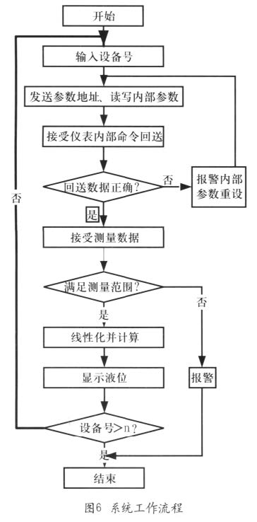 系統(tǒng)工作流程如圖6所示。*先對(duì)容器設(shè)備進(jìn)行基本測(cè)量。輸入容器高度E,滿載高度F及應(yīng)用參數(shù)A(A是用來將儀表調(diào)到滿足測(cè)量要求的應(yīng)用參數(shù))。這些參數(shù)輸入后,由智能顯示儀表或計(jì)算機(jī)得到的操作矩陣將被鎖定,以保證設(shè)置不受意外情況影響,再對(duì)采集到的數(shù)據(jù)線性化(線性化過程描述了測(cè)量電平與罐容量或產(chǎn)品重量間的關(guān)系)之后,測(cè)量值將在相應(yīng)部分顯示出來。