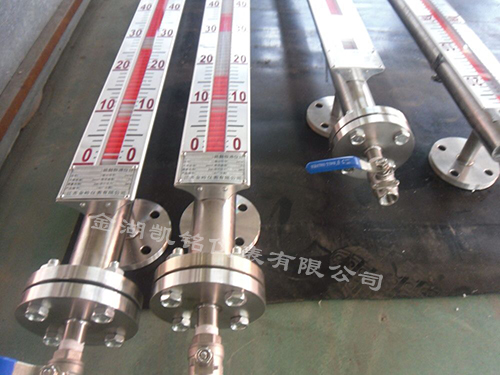 液位計(jì)根據(jù)浮力原理,浮子在測量管內(nèi)隨液位的升降而上下移動,浮子內(nèi)的永久磁鋼通過磁耦合作用,驅(qū)動紅、白色翻柱翻轉(zhuǎn)180’液位上升時(shí),翻柱由白色轉(zhuǎn)為紅色,下降時(shí),翻柱由紅色轉(zhuǎn)為白色,從而實(shí)現(xiàn)液位的指示。