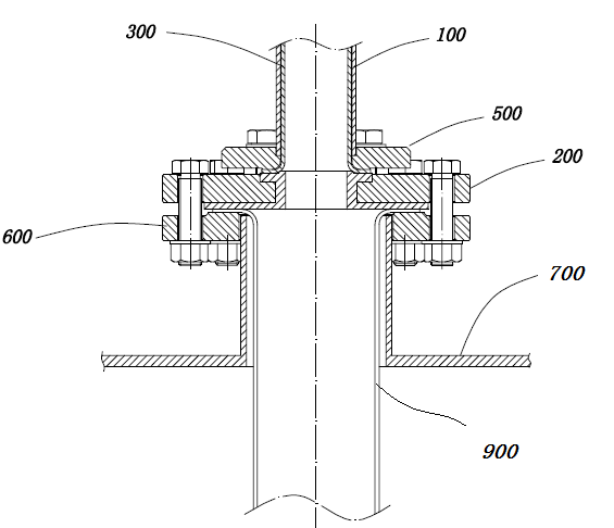 針對(duì)傳統(tǒng)頂裝式海水液位計(jì)的這些弊端,在多次試驗(yàn)的基礎(chǔ)上,對(duì)現(xiàn)有的內(nèi)襯工藝與結(jié)構(gòu)做了改進(jìn),發(fā)明了頂裝式海水液位計(jì)的一種新工藝及其結(jié)構(gòu),如下圖所示,其提供了*一連接件和連接內(nèi)襯。該連接內(nèi)襯具有用于連通內(nèi)襯連接口的*一連接口、自*一連接口向外成環(huán)形設(shè)置的*一密封部、用于與被測(cè)容器連通的*二連接口和自*二連接口向外成環(huán)形設(shè)置的*二密封部。由于該*一連接件和連接內(nèi)襯為單獨(dú)設(shè)置,可以單獨(dú)制造,因此*一密封部和*二密封部可以制作的足夠大,從而實(shí)現(xiàn)*一密封部與浮筒內(nèi)襯的翻折部密封抵接;同時(shí),連接內(nèi)襯的*二密封部用于與容器實(shí)現(xiàn)密封連接。由此,該連接內(nèi)襯可以與浮筒內(nèi)襯和容器開(kāi)口內(nèi)的護(hù)筒形成完全密封的連接,從而避免連接處的金屬面受腐蝕,使生產(chǎn)安全順利地進(jìn)行,免受因發(fā)生生產(chǎn)安全事故對(duì)生命和財(cái)產(chǎn)造成的安全威脅。
