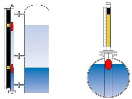 液位計(jì)根據(jù)浮力原理,浮子在測(cè)量管內(nèi)隨液位的升降而上下移動(dòng),浮子內(nèi)的永久磁鋼通過(guò)磁耦合作用,驅(qū)動(dòng)紅、白色翻柱翻轉(zhuǎn)180’液位上升時(shí),翻柱由白色轉(zhuǎn)為紅色,下降時(shí),翻柱由紅色轉(zhuǎn)為白色,從而實(shí)現(xiàn)液位的指示。
